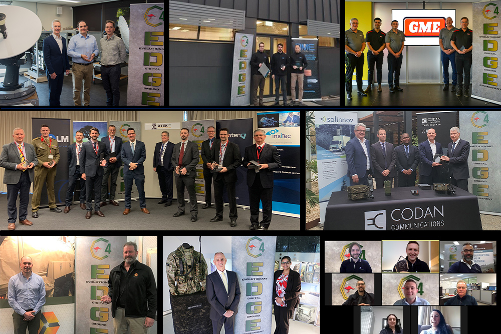 Image: Top left clockwise: QLD partner: EM Solutions; NSW partners: 3ME Technology, GME;  SA partners: Codan Communications with Solinnov; VIC partner: Tectonica; WA partner: Barrett Communications; TAS partner: CBG Systems; ACT partners:  1LM, Insitec MIS, Kord Defence, Outlander Solutions, Penten, Skykraft and XTEK being officially welcomed to Team C4 EDGE by Senator Zed Seselja, Army Colonel Deane Limmer, and EOS Defence Systems CEO Grant Sanderson.